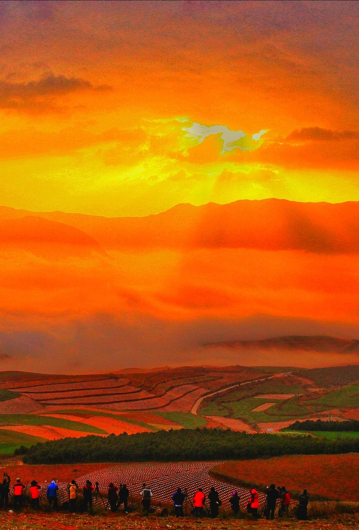 四五月是东川红土地最美的时节。这段时间,农户们开始在红色的土地上播种,绿色的田垄和红色的土地交错在一起,颜色对比极为强烈。日出时分和日落时分是拍照的黄金时间,光线斜射在地面上,土地的颜色被放大到极致。