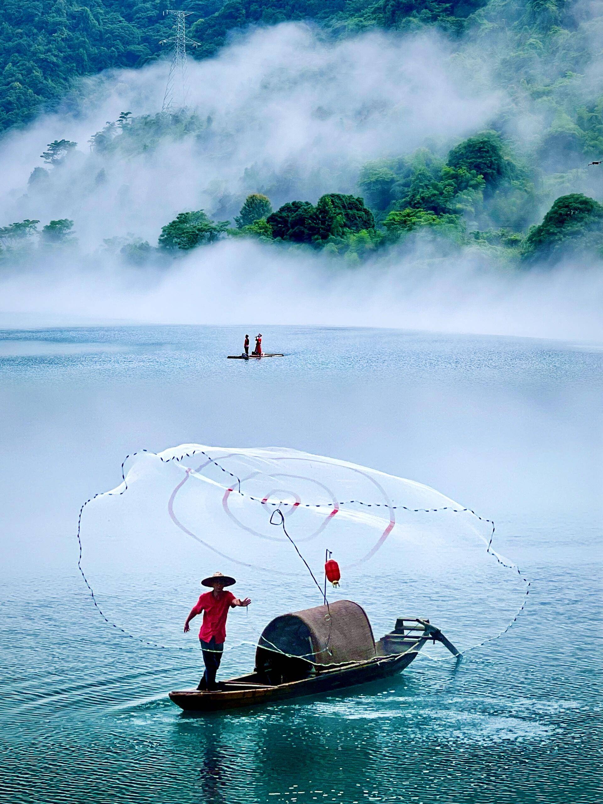 小东江在湖南郴州,是东江湖景区的一部分,以"雾漫小东江"闻名全国。每年4月到10月,清晨时分江面上会升起一层薄雾,渔夫在雾中撒网,画面像一幅水墨画。