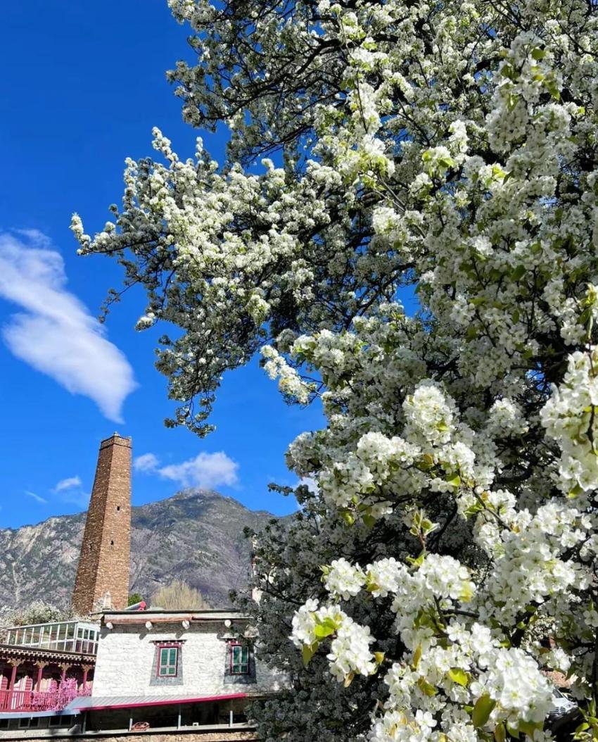 四月的丹巴,气温适宜,山上的桃花和梨花正在盛开,整个山谷被粉色和白色点缀。更重要的是,这个时间段游客很少——旺季要等到夏天的花期和秋天的红叶,四月的丹达处于一个完美的"空窗期"。