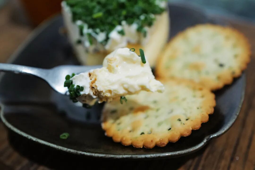 蛋糕体部分是孔泰芝士和蒜香奶酪,奶味醇厚,流心质地,入口非常顺滑。可以搭配香葱饼干一起吃,口感融合得很好。