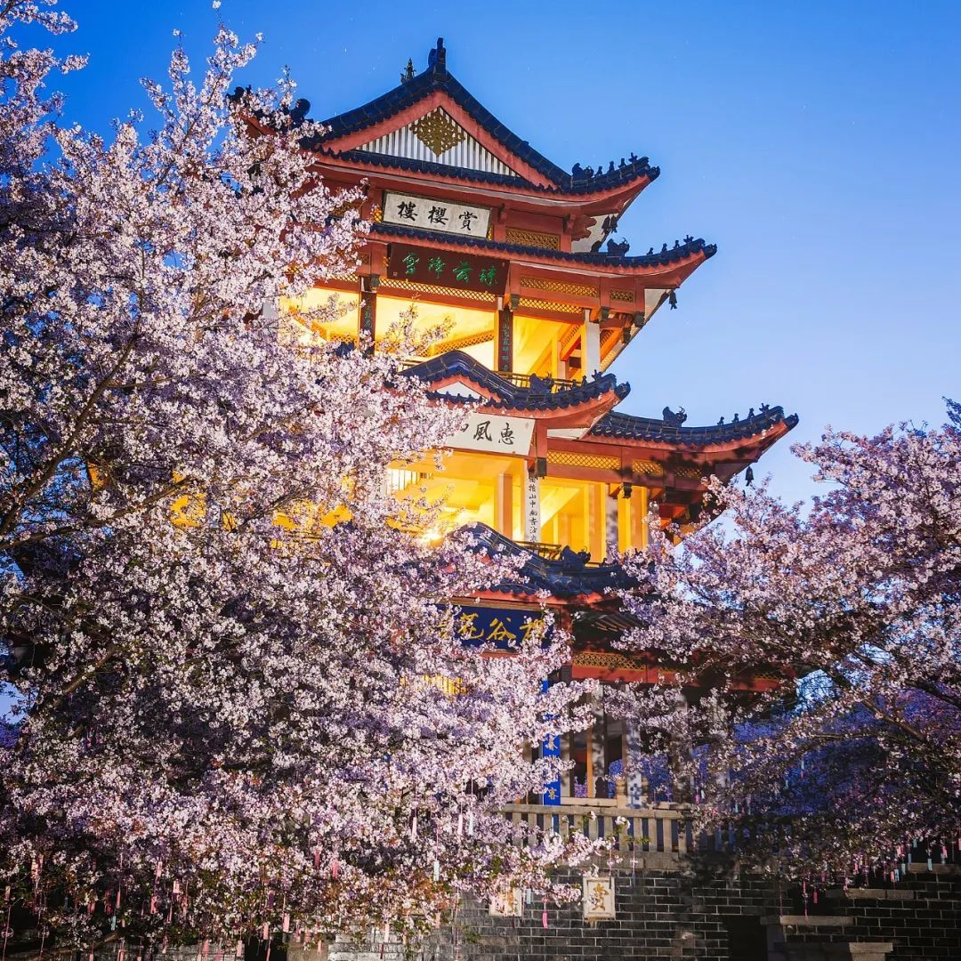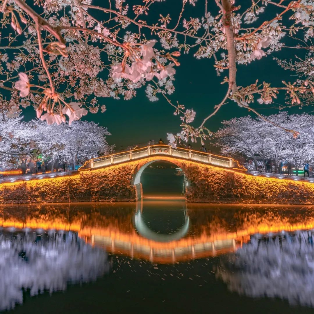 见惯了平时白日的樱花,鼋头渚的夜樱则会给人带来一种全然不同的感觉。三月中旬至四月中旬是鼋头渚樱花盛放的时节,“花气熏古寺,竹影摇画阁”,古色古香的建筑在樱花与灯光的映衬下更是赋予了鼋头渚一层神秘的色彩。登上赏樱楼,便可将园内樱景尽收眼底。放眼望去,满园春色,落英缤纷,黑夜在此时仿佛成为了配角,点缀着这场盛大的樱花会。