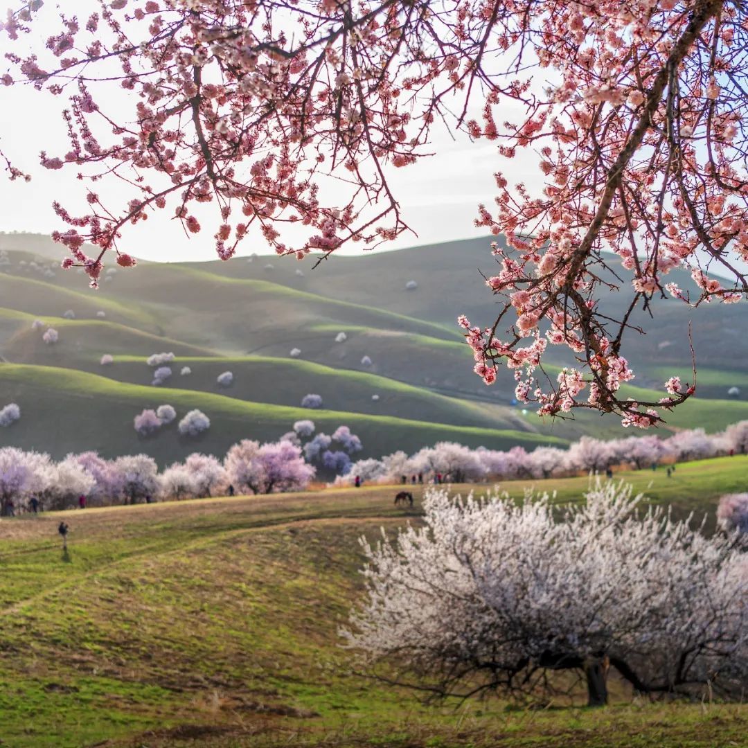 来到吐尔根乡,这片中世纪遗留下来的最大的原始野杏林带给人粗犷而又细腻的美感。三万亩的野杏林如画笔所勾勒出一般,或聚集或绵延,野性而又自由地生长在绿色的山地之上。日出日落之时,阳光与光影穿梭在花林间,这是大自然的馈赠,以最原始的方式表现着最美丽的春天。