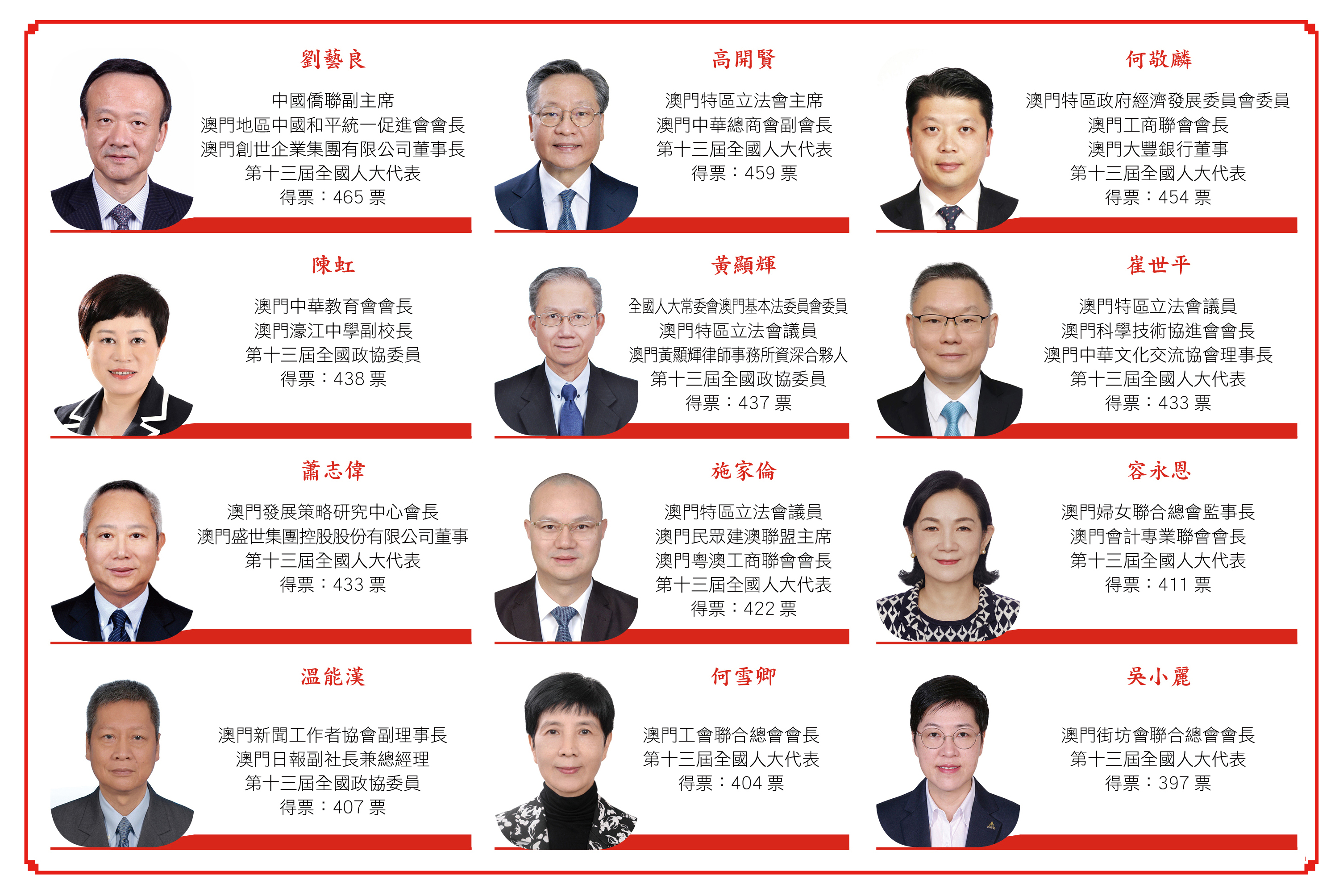 【本報訊】澳區第十四屆全國人大代表選舉昨日順利投票選出新一屆12位澳區全國人大代表,九位現屆代表全數成功連任,連任的劉藝良以465票成為“票王”, 另有三位現屆全國政協委員黃顯輝、溫能漢和陳虹新入局。根據《中華人民共和國澳門特別行政區選舉第十四屆全國人民代表大會代表的辦法》的規定,選舉會議主席團已將選舉結果報送全國人民代表大會常務委員會代表資格審查委員會,進行代表資格審查。全國人民代表大會常務委員會將根據代表資格審查委員會提出的報告,確認代表資格,公佈代表名單。