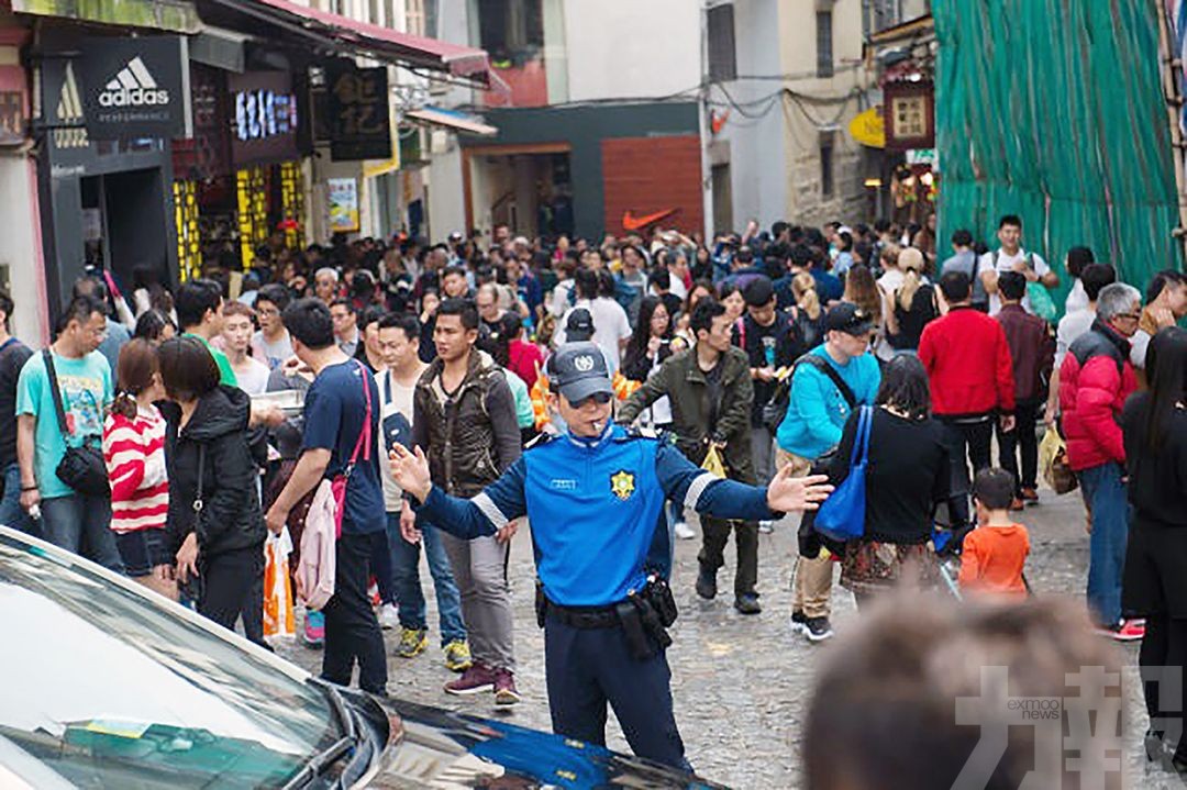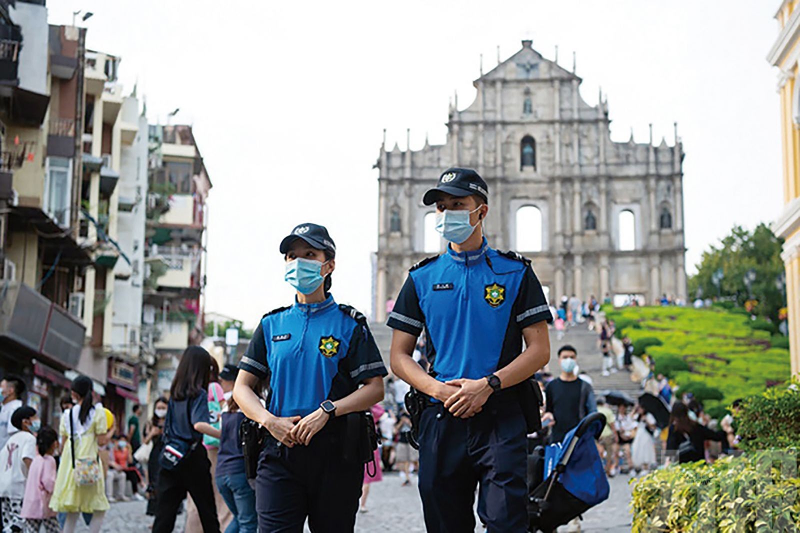 粤港澳三地旅游部门就合力推动大湾区旅游业高质量发展达成三点共识。图为澳门旅游警察在大三巴牌坊前地巡逻。(新华社图片)