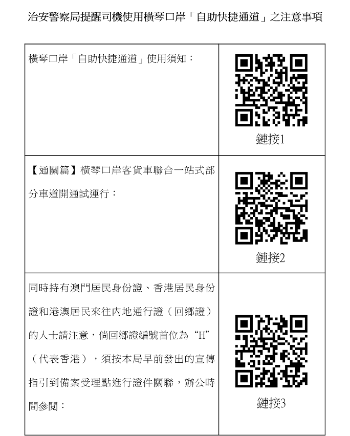 經對近日車道通關情況進行分析,發現無法經「自助快捷通道」通行的車輛,常見於司機的澳門居民身份證晶片損壞,又或未按本局在車道試運行前發出的宣傳指引辦妥琴澳兩地自助快捷通關備案手續(例如持用因公往來香港澳門特別行政區通行證的司機辦妥內地邊檢「一站式」備案手續後,未到本局受理點辦理澳方備案),導致須倒車改用「人工通道」,從而影響通關效率。因此,治安警察局再次提醒: