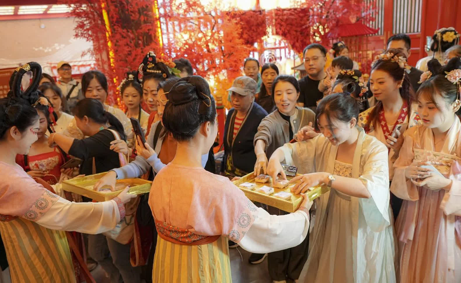 長安十二時辰向來自全國的遊客分發月餅。(受訪者供圖)