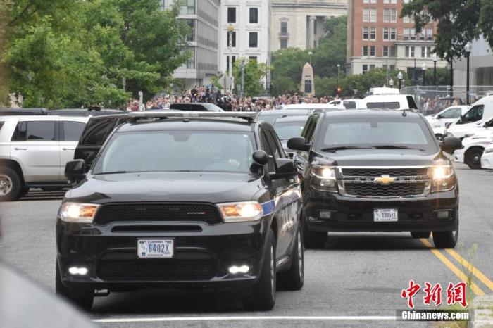 资料图:当地时间2023年8月3日,美国前总统特朗普在首都华盛顿一家联邦法院出庭应诉,对试图推翻2020年总统大选结果的指控表示不认罪。图为结束出庭后,特朗普车队驶离联邦法院。中新社记者沙晗汀摄