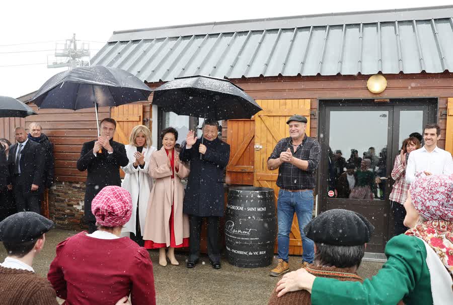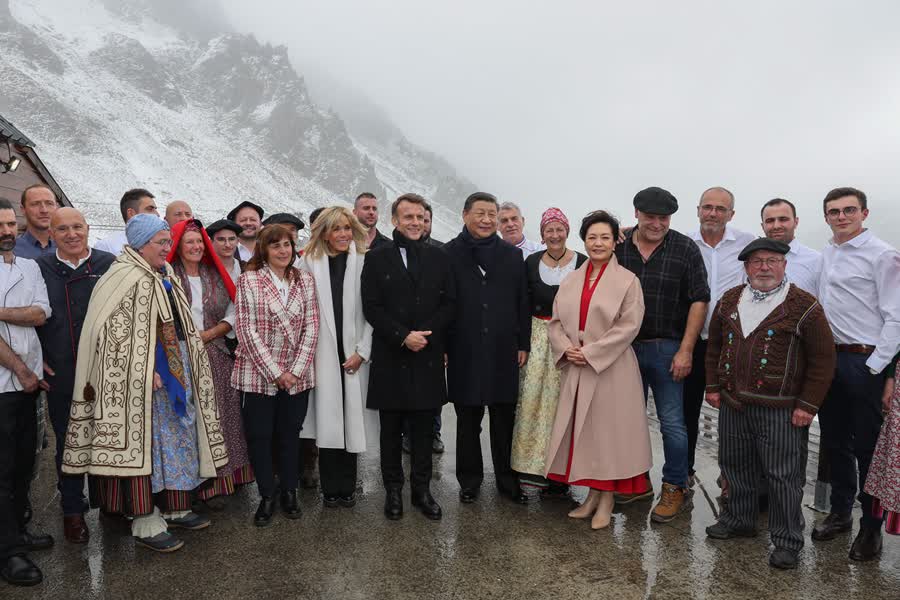 馬克龍總統和布麗吉特在圖爾馬萊山口「牧羊人驛站」迎接習近平和彭麗媛,共同欣賞當地村民表演的具有濃郁南法風情的牧羊人之舞,並同他們親切合影。