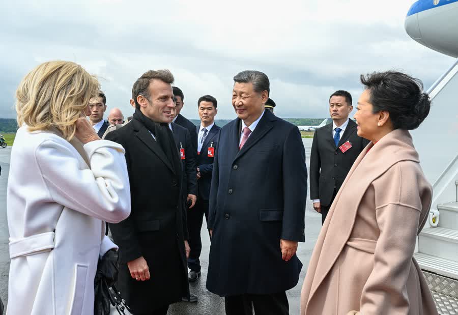當地時間5月7日,應法國總統馬克龍特別邀請,國家主席習近平乘專機來到法國西南部上比利牛斯省訪問。這是習近平和夫人彭麗媛在塔布機場受到馬克龍和夫人布麗吉特熱情迎接。新華社