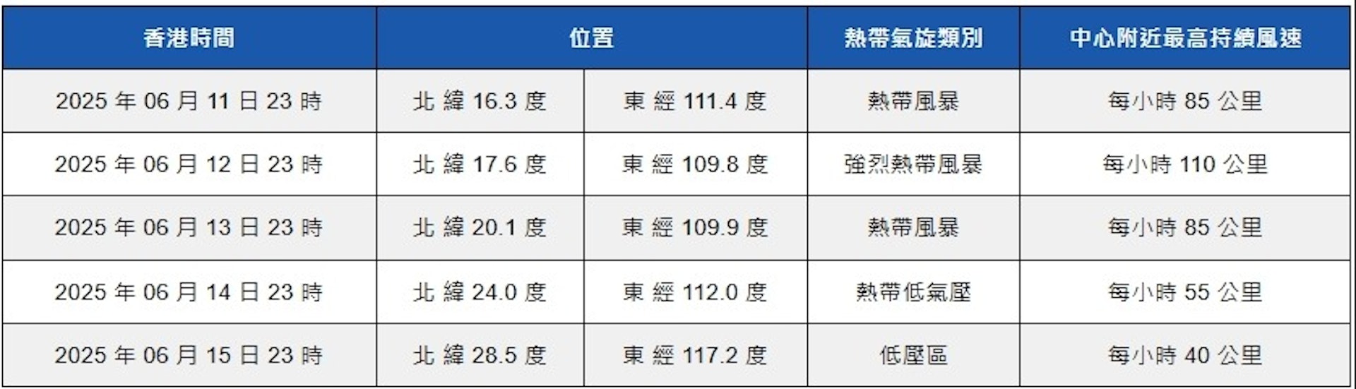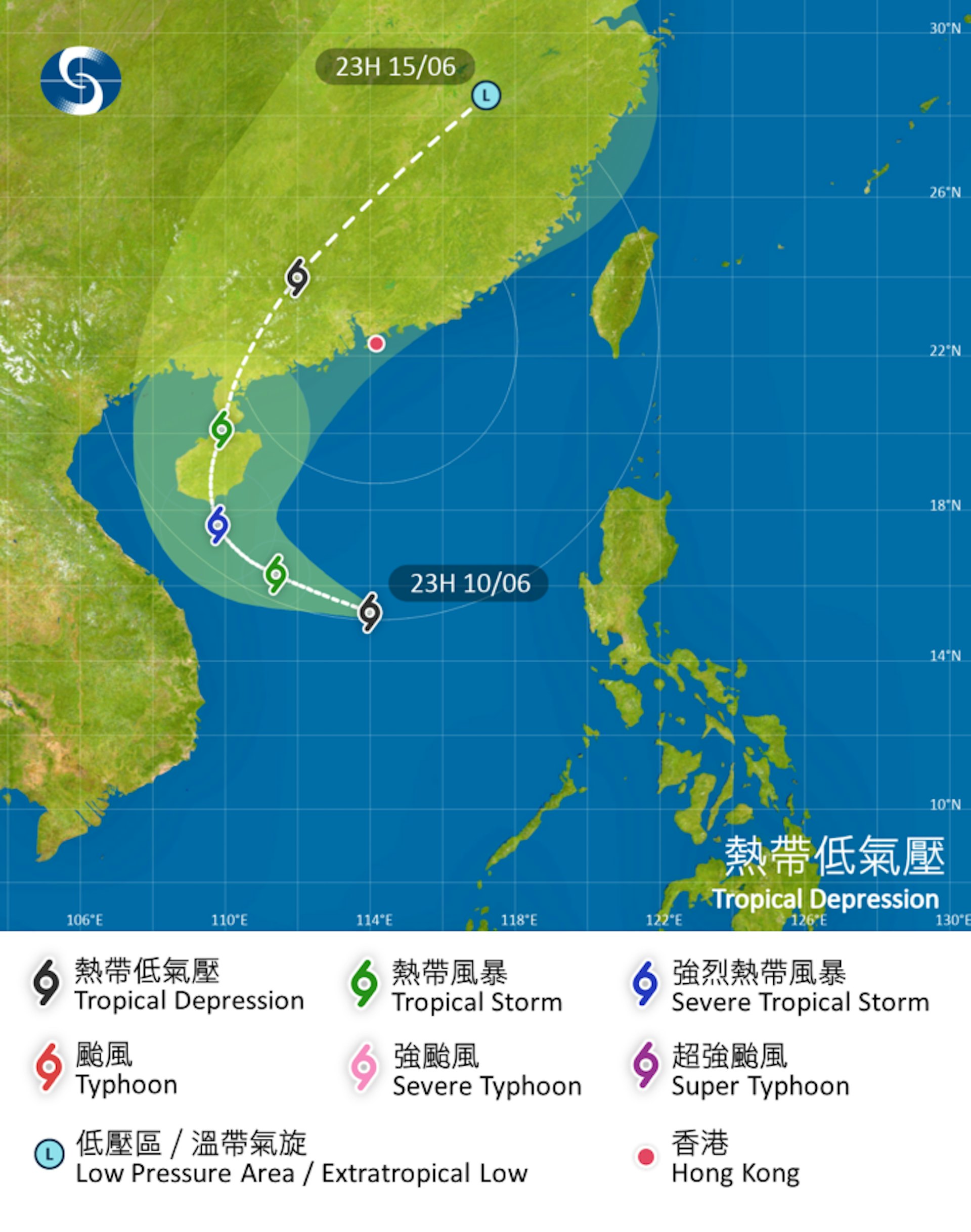 熱帶低氣壓今日仍與本港保持超過700公里距離,預料本港今日尚未普遍吹強風,但與其相關的外圍雨帶會影響南海北部。天文台會視乎其強度、與本港的距離及本地風力變化,評估是否需要在周四(12日)稍後至星期五(13日)改發三號強風信號。
