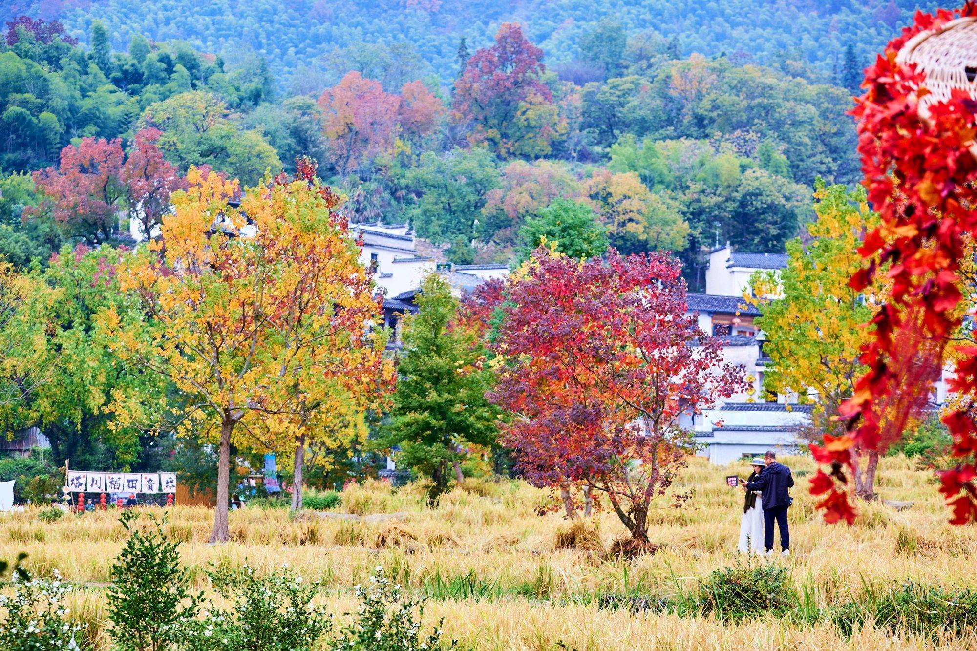 粉墙黛瓦的徽派建筑掩映在依然碧绿的藤蔓中,屋檐下晾晒的衣物随风轻摆,红色对联和灯笼呼应着“塔川欢迎您”的标牌,浓浓秋意就这样裹上了人间烟火气。红叶如火、黄叶似金,薄薄雾霭笼罩着不远处山间高低错落的老房子,一片浓烈的秋色中塔川反而显得更加素雅宁静。