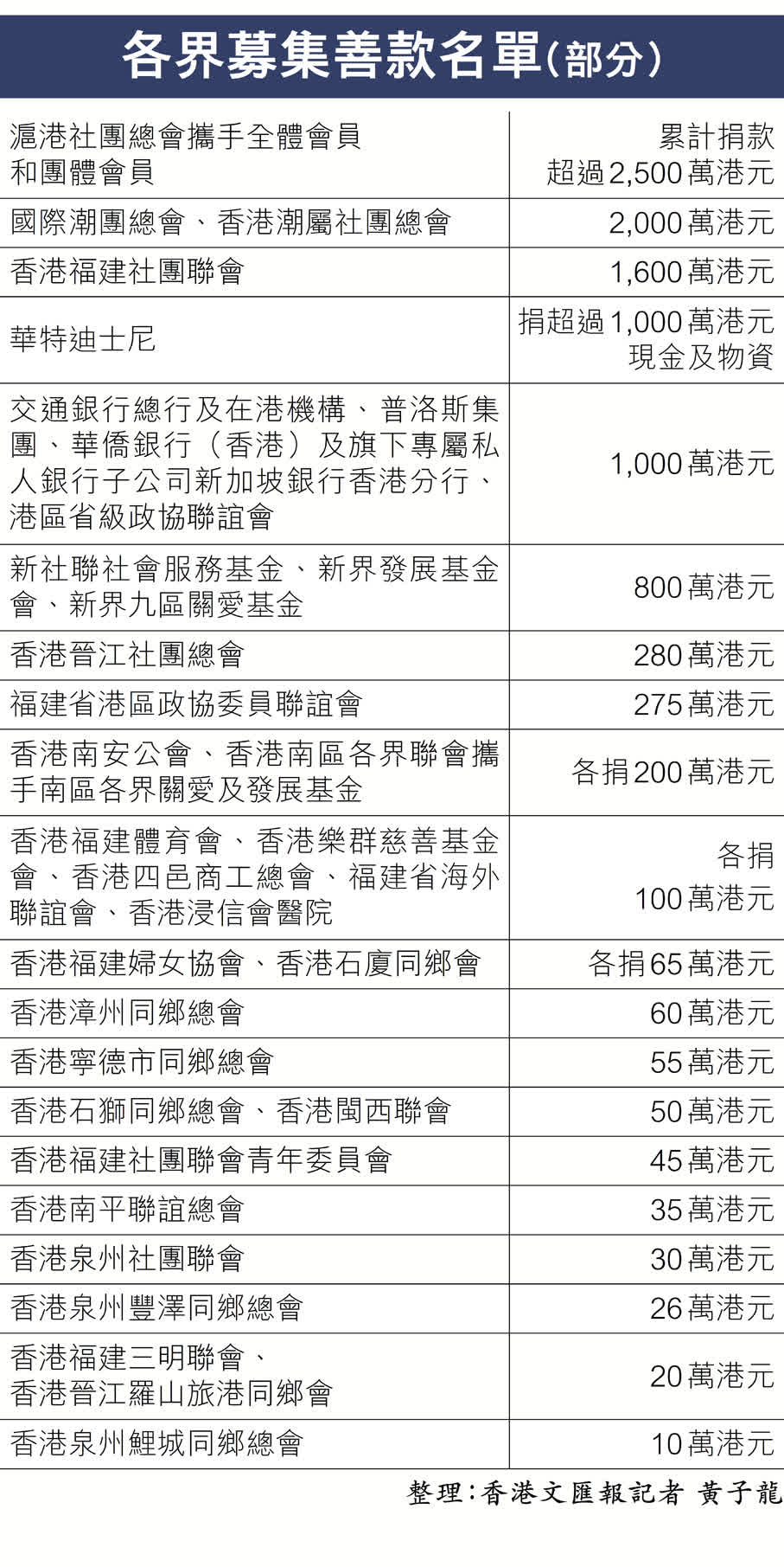 (記者 黃子龍、蔡競文)社會各界眾志成城,馳援大埔火災災民。其中特區政府成立的「大埔宏福苑援助基金」,截至昨午一時,基金總額已有約16億元,會用於協助居民重建家園,是長期和持續的支援。另外,香港福建社團聯會截至昨日中午12點,募集賑災款項已達3,186萬港元現金。國際潮團總會、香港潮屬社團總會啟動支援大埔賑災,籌到超過2,000萬港元善款。