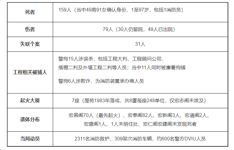香港大埔宏福苑五級大火,釀成逾百人死亡慘劇。截至週五(12月5日)大火已造成159人死亡,當中包括一名殉職消防員;另有31人仍失聯。目前,警方已拘捕21名工程相關人士。其中15人涉嫌誤殺被捕,包括大判工程公司、工程顧問公司、二判搭棚公司、二判外牆工程公司;另有6名被捕人爲消防裝置承辦商相關人士,涉嫌向消防處作出虛假陳述。