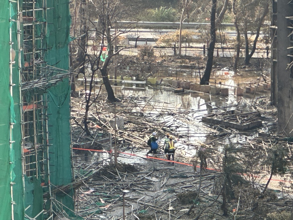 【10:20】早上“災難遇害者辨認組”人員繼續進駐火場蒐證,棚架的竹枝滿地,而毗鄰的廣福休憩處仍是市民悼念的聚集點,擺滿悼念的花束,形成一片花海。