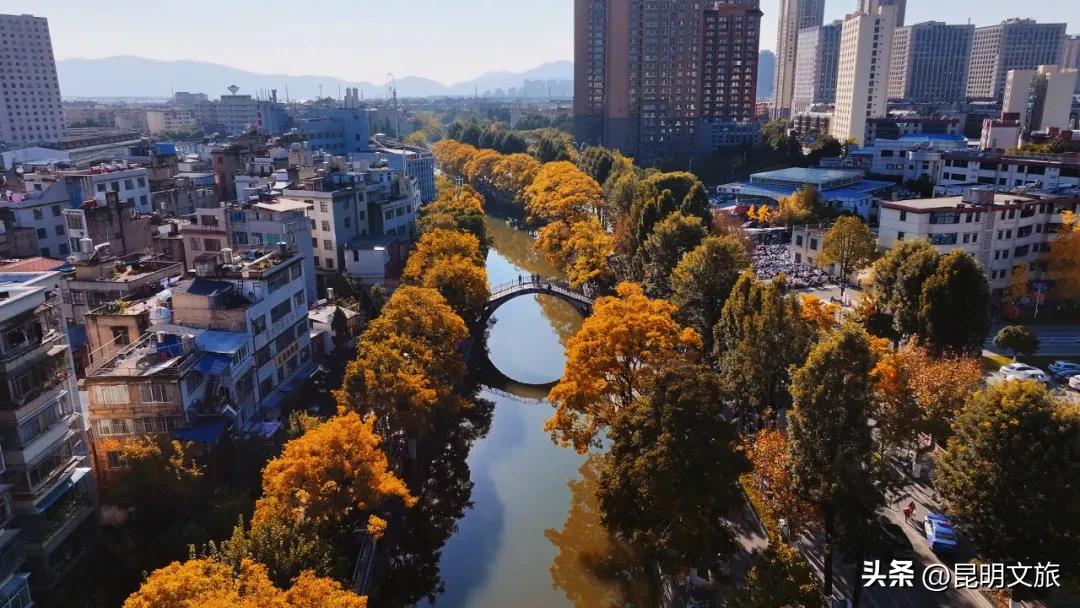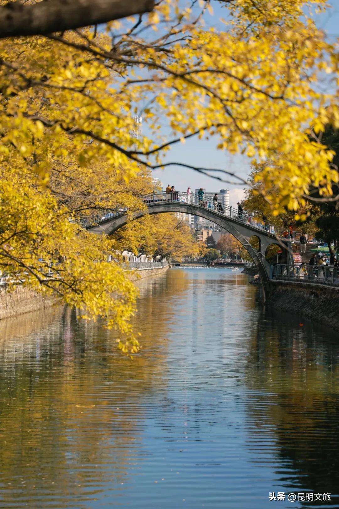 此刻,大观河沿岸的滇朴古树已经变黄,将一整条河道渲染成流动的金色长廊。