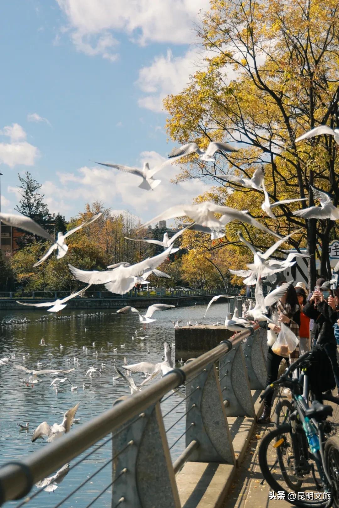 秋园公园沿岸:水域开阔,可拍滇朴倒影及抓拍人与鸥、金黄叶片同框的生态美景。