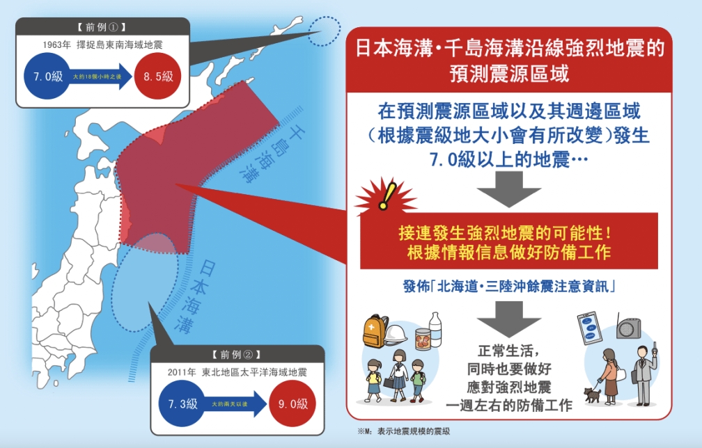 当局指出,此次地震属于日本海沟及千岛海沟巨大地震的想定震源带,意味未来一周内于相近区域出现更大规模地震的风险显著上升,要求北部与东北沿岸182个市町村,在未来一周迅速采取防灾行动,提高警戒。