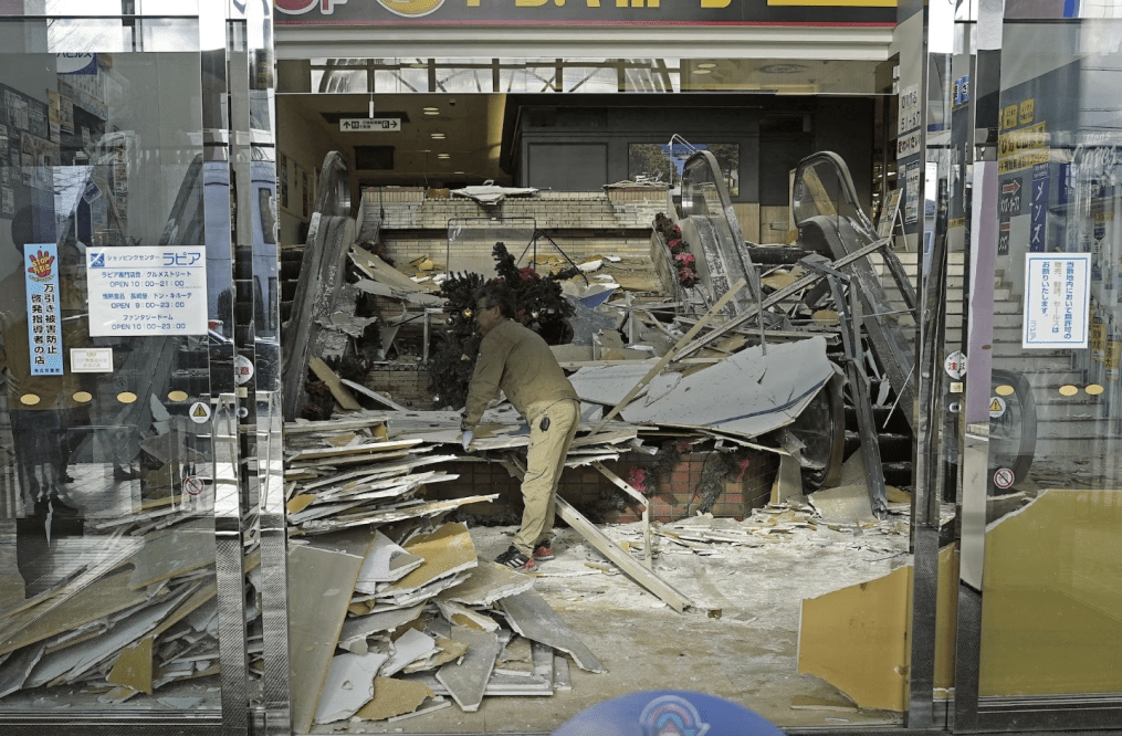 ▲在重灾区青森县八户市,有购物中心部分天花板倒塌。路透社