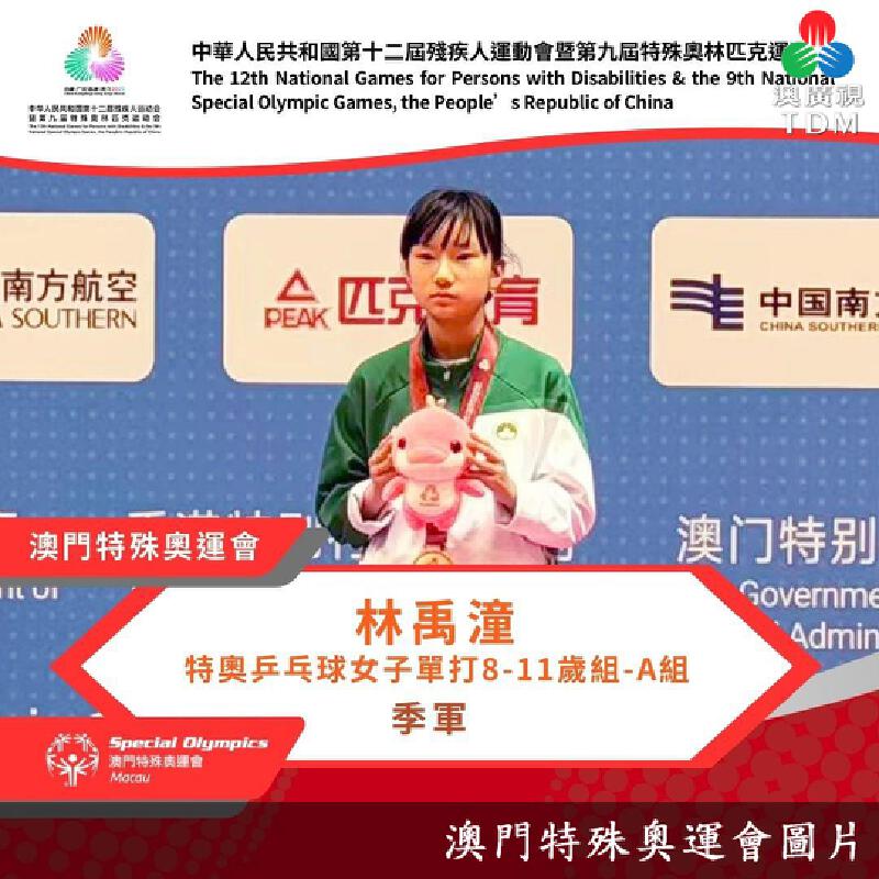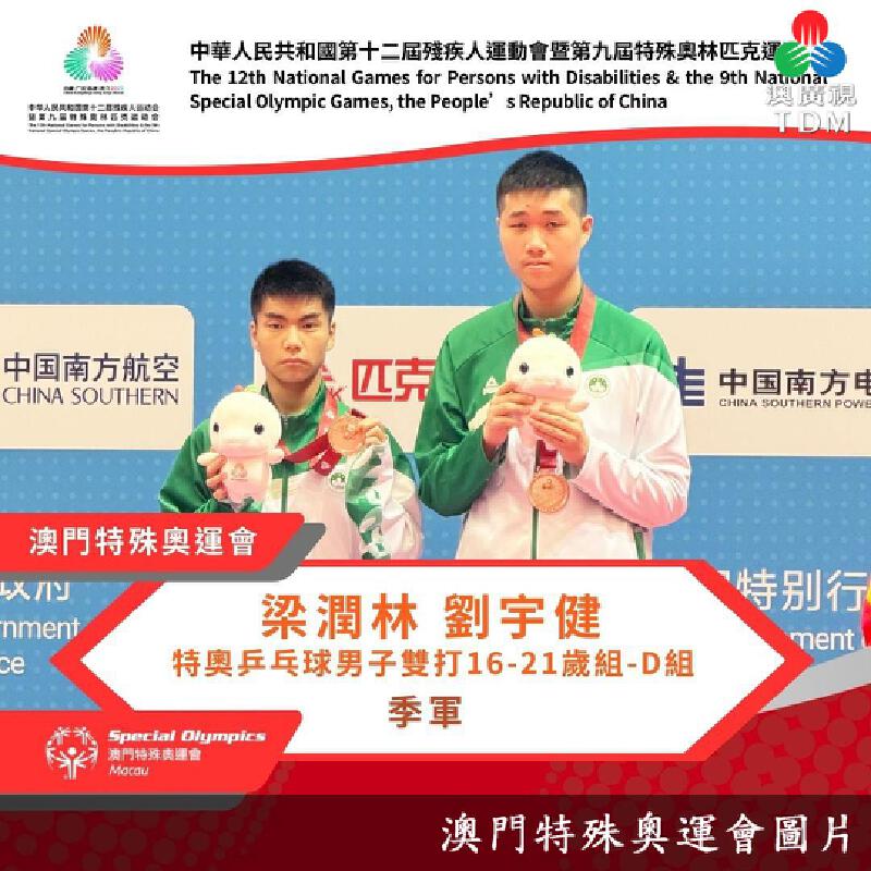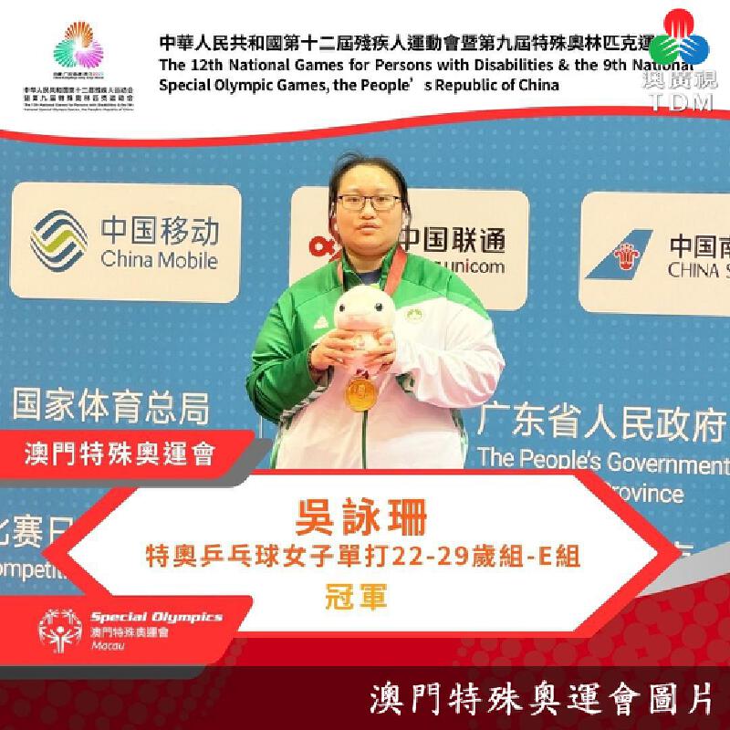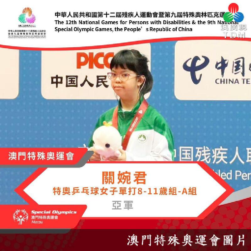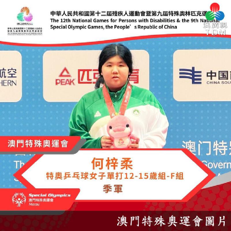 至於在香港舉行的特奧乒乓球項目,澳門隊吳詠珊在女子單打 22-29歲組E組以局數 3:0擊敗貴州球手,奪得金牌;關婉君在女子單打 8-11歲組小組賽A組賽事,以局數 3:1戰勝隊友林禹潼摘銀,林禹潼奪得銅牌;何梓柔在女子單打 12-15歲組F組取得銅牌;而梁潤林和劉宇健組合則在男子雙打 16至 21歲D組奪得銅牌。