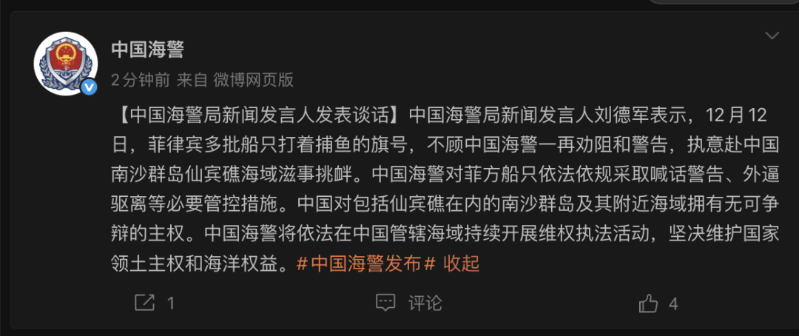 12月12日,中國海警局新聞發言人劉德軍表示,12月12日,菲律賓多批船隻打着捕魚的旗號,不顧中國海警一再勸阻和警告,執意赴中國南沙羣島仙賓礁海域滋事挑釁。中國海警對菲方船隻依法依規採取喊話警告、外逼驅離等必要管控措施。中國對包括仙賓礁在內的南沙羣島及其附近海域擁有無可爭辯的主權。中國海警將依法在中國管轄海域持續開展維權執法活動,堅決維護國家領土主權和海洋權益。