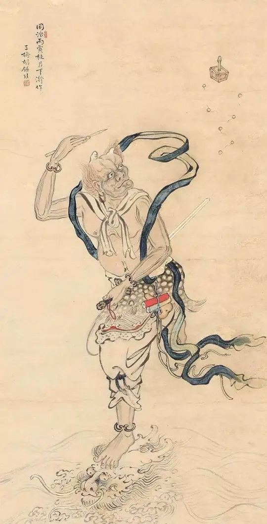 明清时期,岭南士子普遍热衷于供奉“魁星踢斗”图。图为清末画家胡锡珪所绘,图中,主管文运的魁星一脚稳立于鳌背之上,构成“独占鳌头”的生动画面。