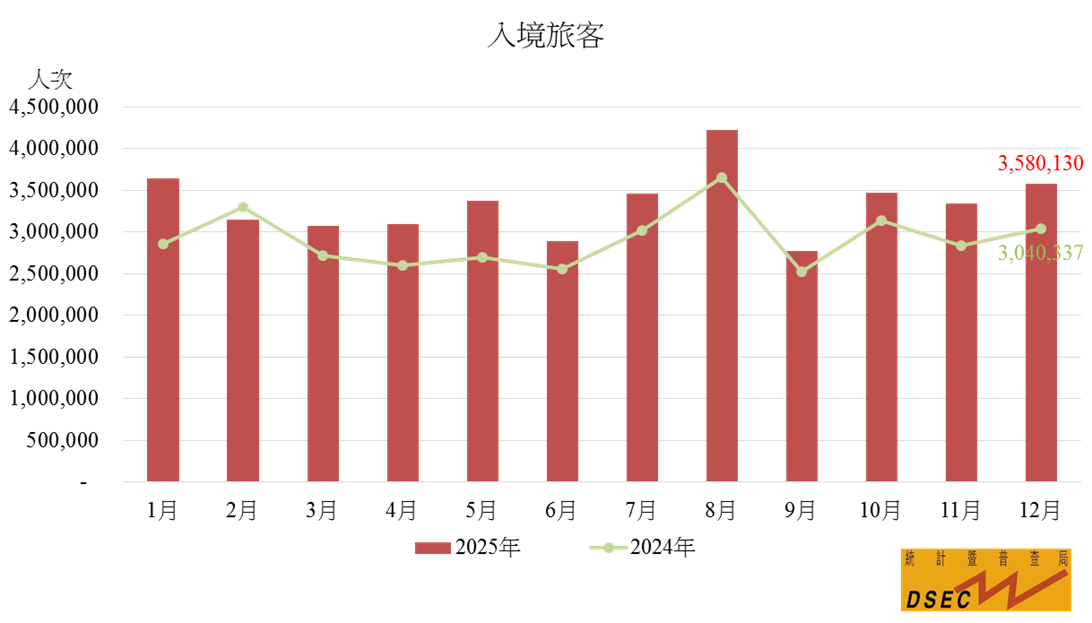 2025年12月的入境旅客共3,580,130人次,按年上升17.8%;不過夜旅客(2,107,339人次)及留宿旅客(1,472,791人次)分別增加23.0%及10.9%。旅客平均逗留時間按年縮短0.2日至0.9日;留宿旅客的平均逗留時間(2.1日)減少0.2日,不過夜旅客(0.2日)則持平。