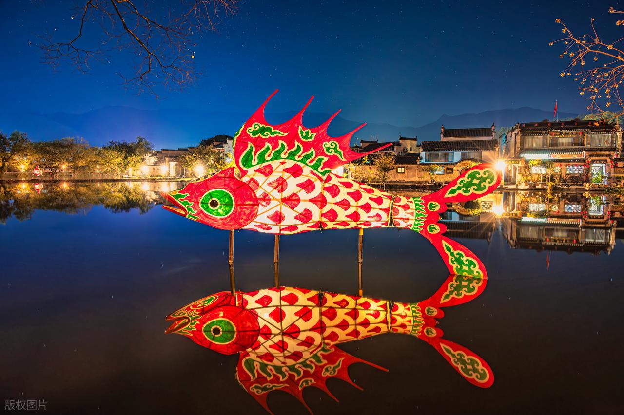 除了赏花,可以前往徽州古城逛逛,没有门票,晚上19:30—20:30有鱼灯巡游和非遗民俗表演等,徽州的马头墙与夜色相映,流光溢彩,鱼灯穿梭,徽味中国年难得一过!