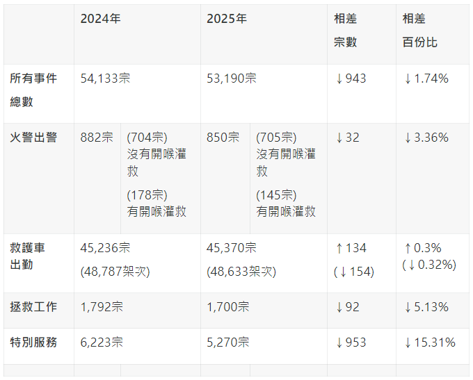 2025年全年救護車出勤宗數為45,370宗,較2024年上升了134宗,升幅只為0.3%。整體救護個案以頭暈、腹痛、發燒及挫傷等事件為主。