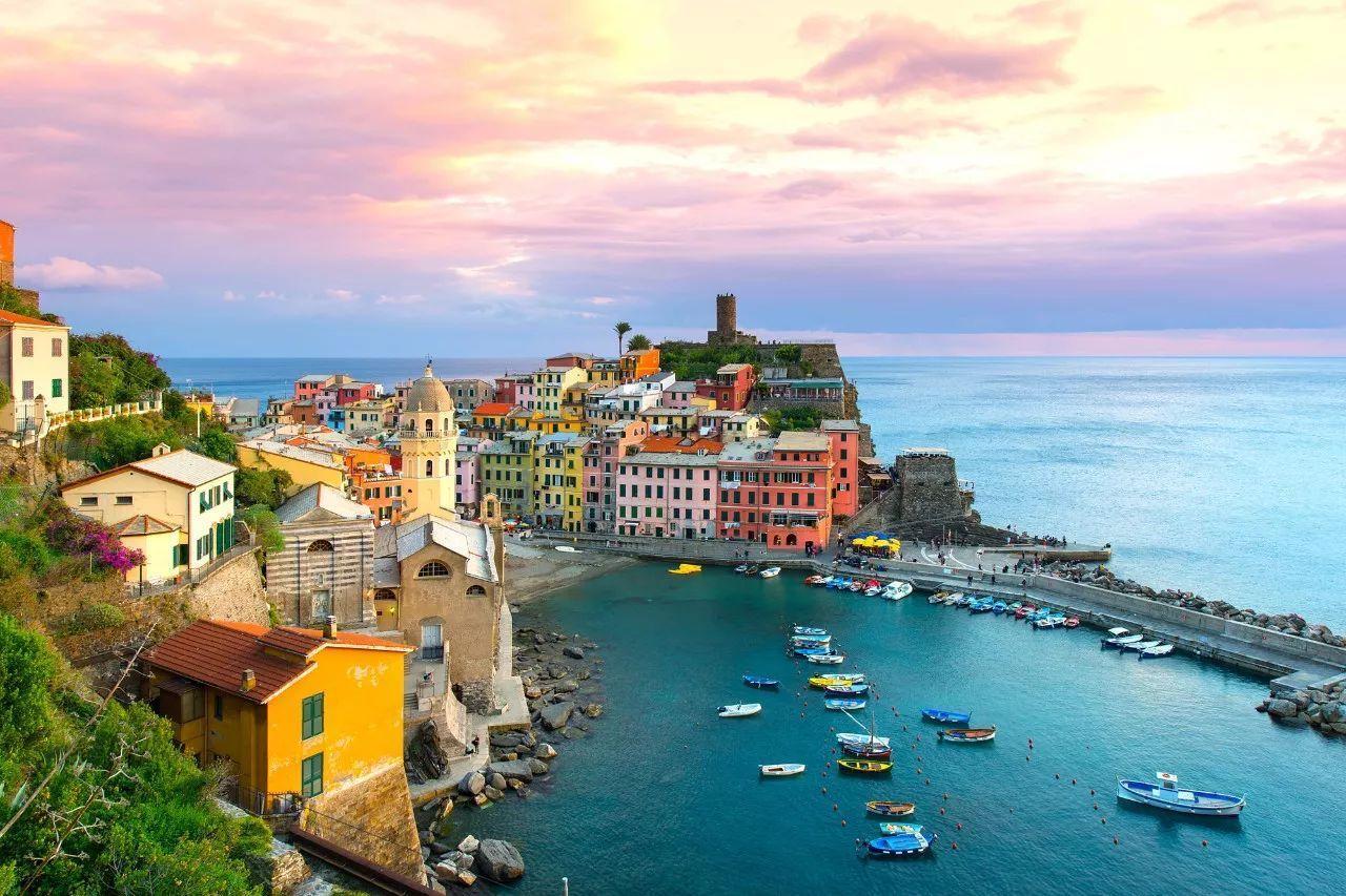 清晨的蒙特罗索,渔船刚从海上归来,渔民在沙滩上整理渔网,彩色的房子被朝阳镀上金边,咖啡的香气从路边的小店飘出;走在“爱之路”(Via dell'Amore)上,一边是悬崖峭壁,一边是蔚蓝的地中海,沿途的栏杆上挂满了情侣们的同心锁,海风带着咸湿的味道;黄昏的 Vernazza 村,坐在海边的餐厅里,点一份海鲜意面,看夕阳沉入海面,把海水染成橘红色,远处的帆船像剪影一样划过,美得像一幅印象派油画。