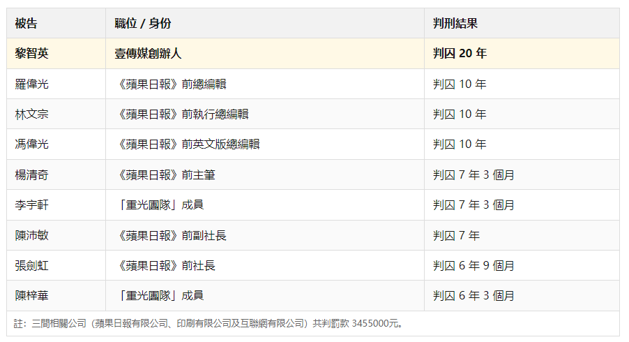 前高層及主筆:羅偉光、林文宗、馮偉光各獲刑10年;楊清奇判囚7年3個月;陳沛敏判囚7年;張劍虹則獲刑6年9個月。