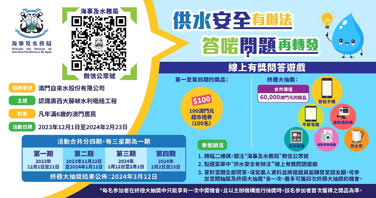 “供水安全有辦法"分四期進行,設有每期抽獎及終極大抽獎,獎品豐富。歡迎市民即日起至2月27日參加第三期活動。凡答對五條問題、正確填寫個人資料,並將遊戲頁面分享至微信朋友圈的參加者,便可符合當期抽獎和終極大抽獎的資格,有機會獲得超市禮券。有興趣的市民可到“澳門海事及水務局"微信公眾號參與活動和了解詳情。