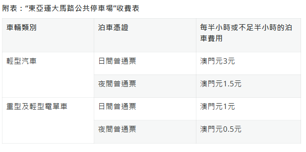 為優化泊車管理,交通事務局繼媽閣“航海學校公共停車場”實施新管理模式後,也將氹仔東亞運大馬路海濱休憩區原咪錶位調整為戶外公共停車場的管理模式,以提升車位流動性,方便公眾使用。該停車場命名為“東亞運大馬路公共停車場”,於2月14日起正式投入運作。