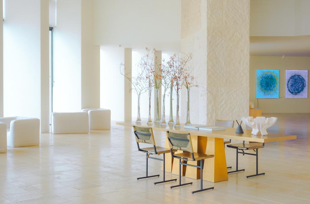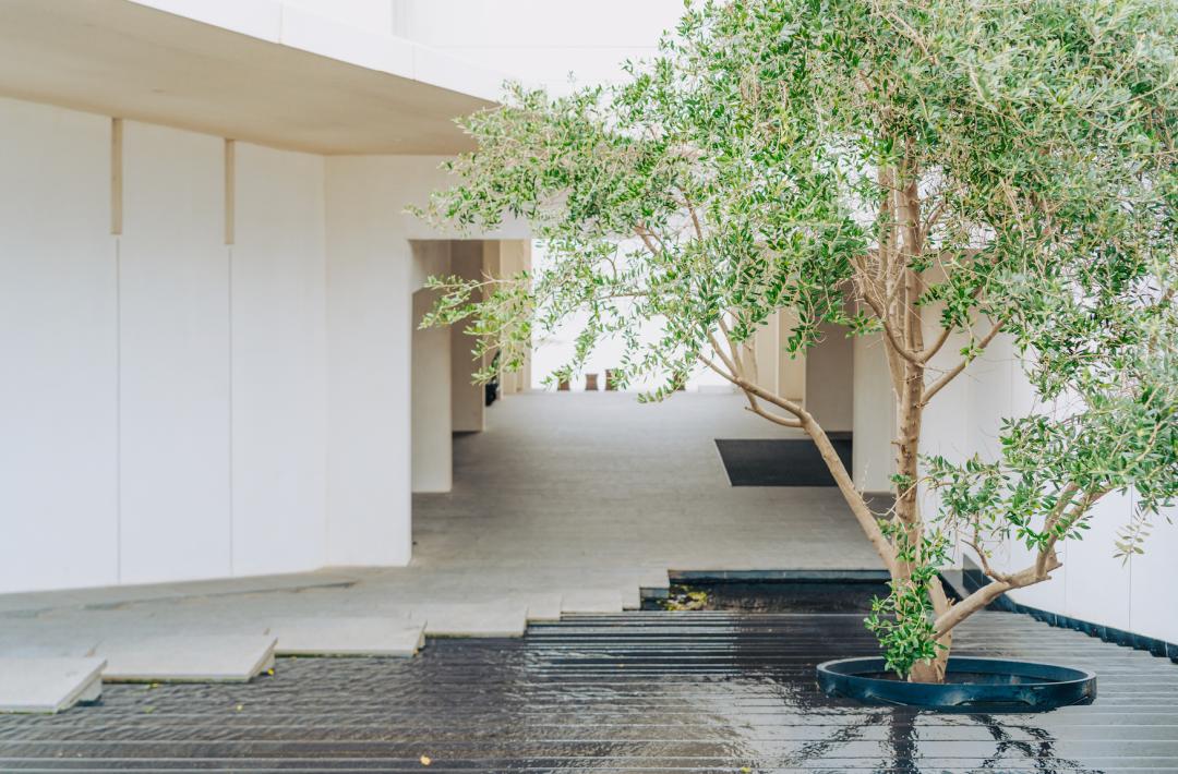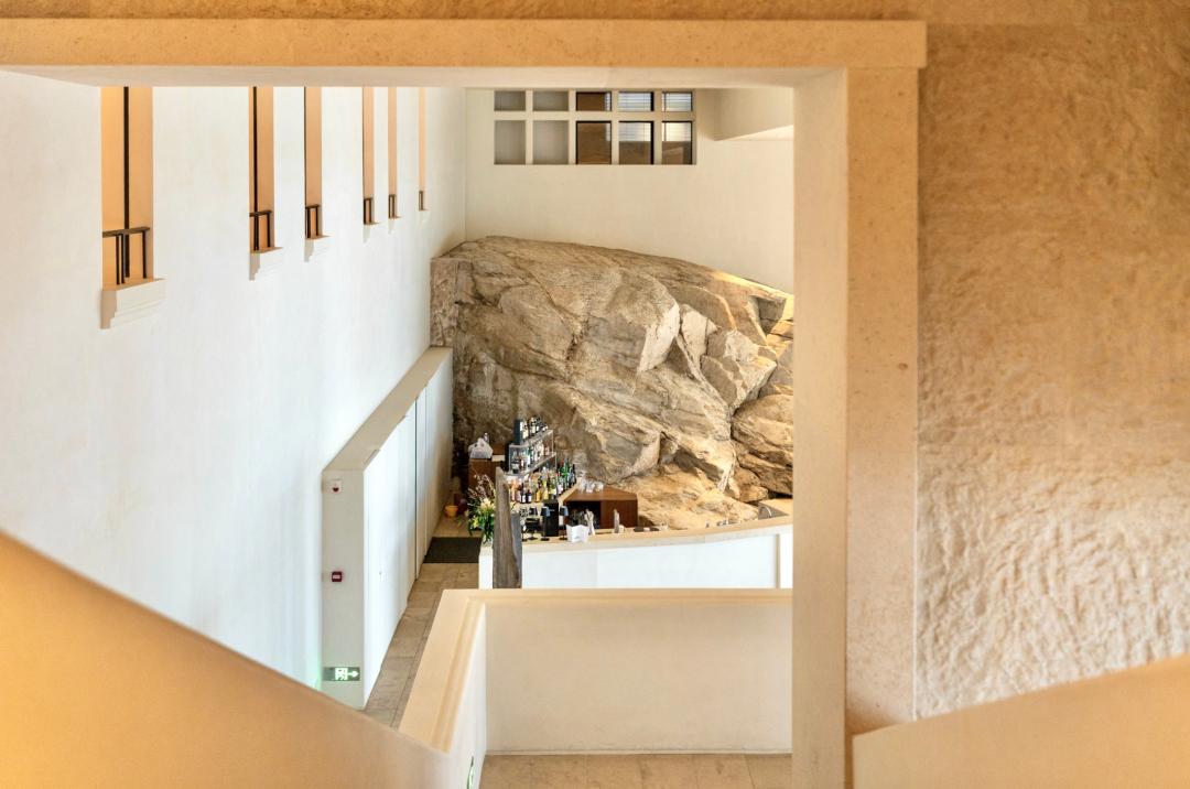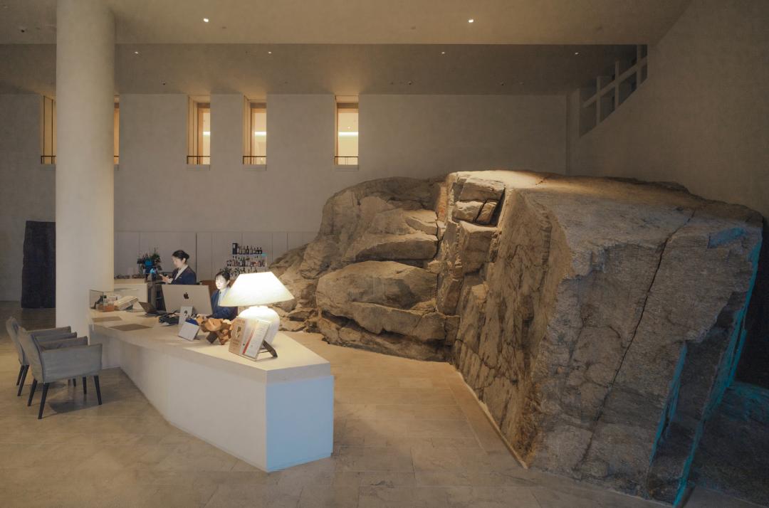 于是你走进大堂,会看到一块巨大的礁石就这么竖在那儿。和现代的立柱、光影、玻璃幕墙搅在一起。石头没打磨,没修饰,还是亿万年前的样子,只是边上多了点人。