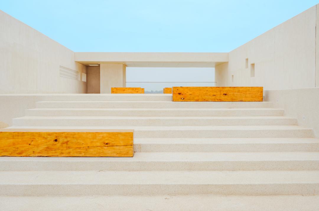 然后,谢珂把光引了进来,让阳光在不同的时间段进入到酒店的不同角落,让柱子投下影子,让玻璃反射海面。