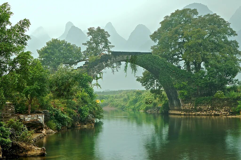 之后穿行于河岸的农舍花田之间,途经水泥水坝和大石寨,到达高大的遇龙桥。在桥上打卡后继续沿西岸前行,从金龙桥过河,此处漂流风景最好。继续向前,打卡阳朔最高的单孔石桥富里桥后,掉头向南,沿遇龙河东岸的小路南下,途经仙桂桥和旧县村的古民居。最后从双流义渡亭附近的路口向东,穿过桂林千古情的巨大头像之后,便可返回凤鸣游客中心还车了。骑行全程约45公里,若觉得太累,也有电动车和挎斗车可供选择。