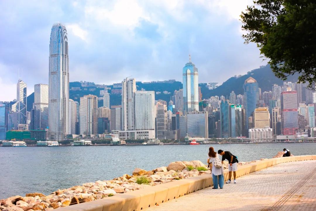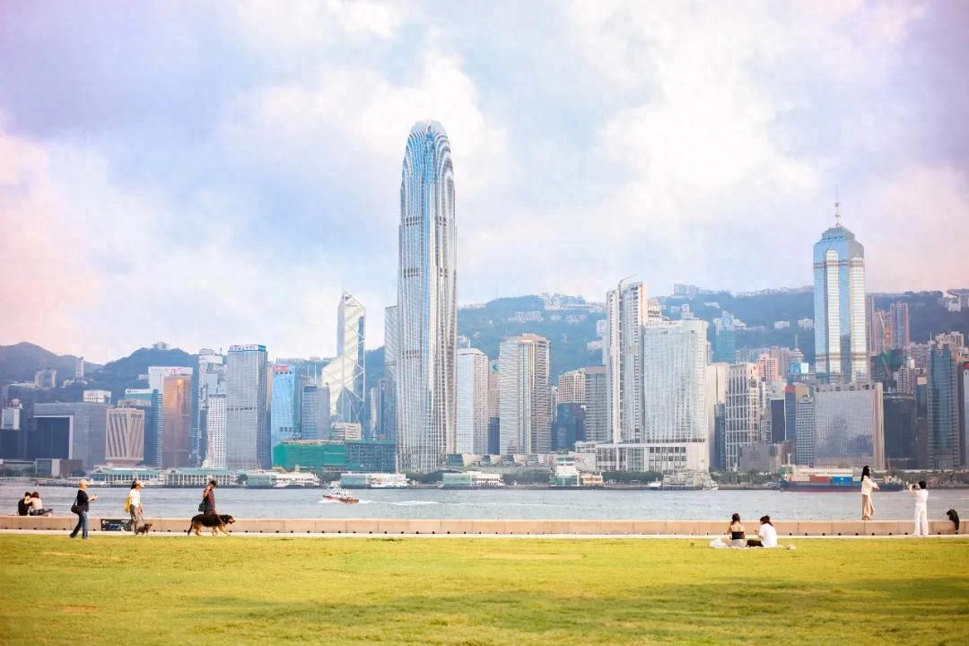 坐在台阶上,面前就是整片维多利亚港的天际线,从九龙站到中环摩天轮尽收眼底。
