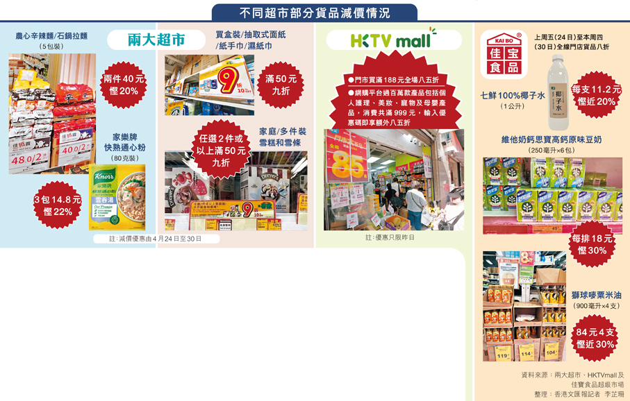 兩大超市早前推出限時快閃八八折優惠,打響超市減價戰第一槍。隨後,佳寶推出為期7天的八折優惠迎戰,戰火更由實體門店蔓延至網店市場,HKTVmall昨日推出八五折優惠,涵蓋超市、個人護理、美妝、寵物及母嬰產品,只要上述類別產品消費滿999元,輸入優惠碼便能享有折扣優惠。此外,HKTVmall更預告續推更多驚喜優惠。