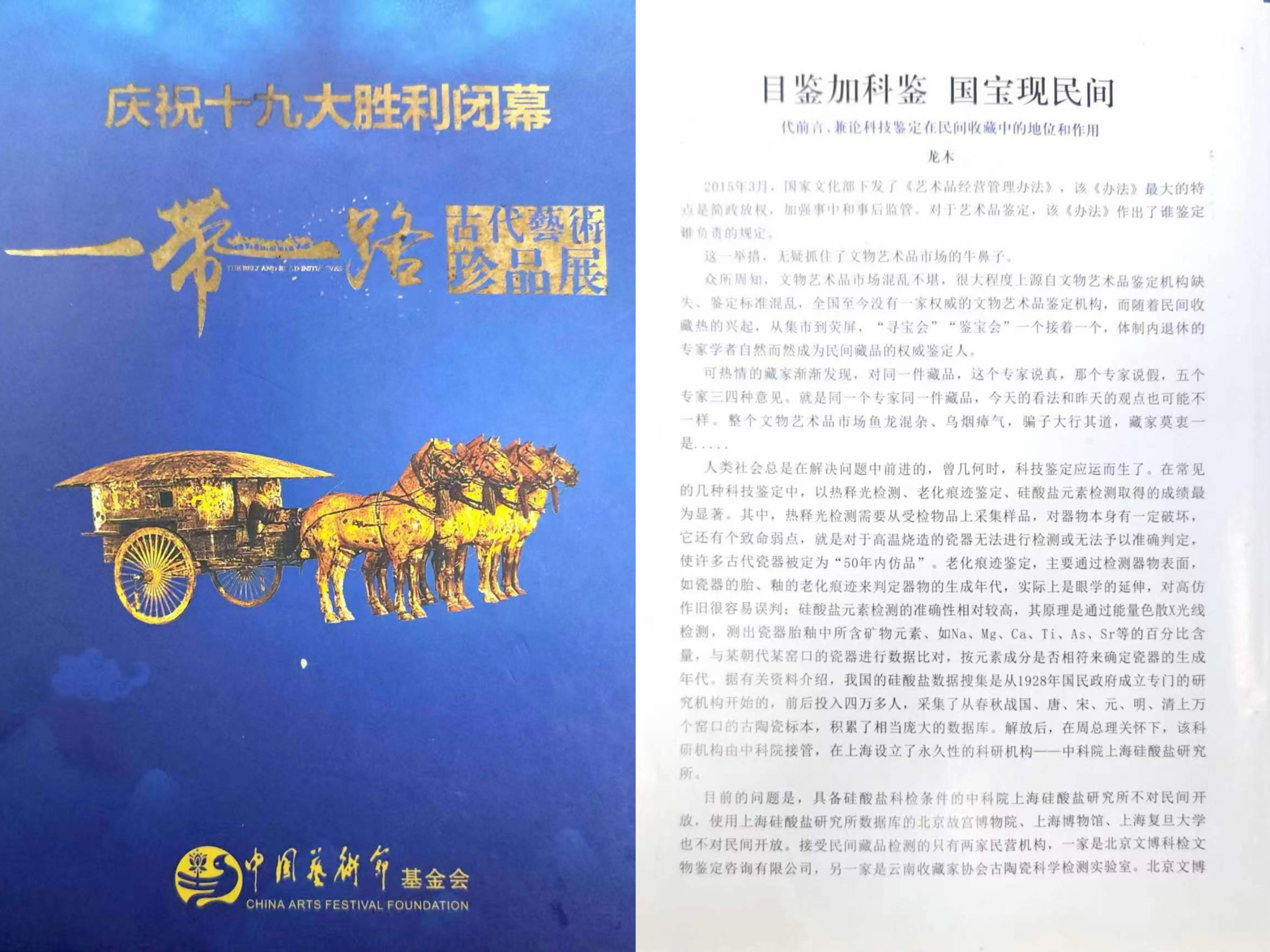 庞馆长喜欢收藏达30年之久,至今保存着1993年在西安收购的一件战国青铜器。2009年9月在国企退休后,他想把自己收藏的艺术品整理一下,弄清楚一些,便开始向专家请教,没想到他从珠海跑到广州、香港,再跑到北京、上海,一圈下来,往往十个专家九种意见,再加上某些伪专家打压民藏,一面说十墓九空,一面说民间藏品99%是赝品。他纠结了,犹豫了,收藏还要不要搞下去?在他犹豫不决的时候,2014年珠海航展,哈尔滨收藏家协会杨会长和他女儿来珠海,得知他的纠结后介绍说,云南收藏家协会在深圳有个实验室,是仪器鉴定,与上海硅酸盐研究所数据库合作,很准。庞馆长心头一亮,很快便挑选了十件瓷器到深圳进行检测。为验证对方仪器是否准确,他选的十件瓷器都是有款的,经过数据比对,有五件检测结果和底款是一致的,有四件不一致是现代仿品;有一件底款是乾隆年制,检测结果是光绪时期制作的,检测人员说,这叫寄托款,官仿官,不算假。这次检测对庞馆长鼓励很大,仪器是不会说假话的,他连续去了深圳几次,检测了数十件藏品。到2015年4月,国务院十五个部委开会,确定了仪器专家相结合,仪器检测为主,专家检测为辅的艺术品鉴定方针。方向明确后,庞馆长对当时常见的几种仪器进行了考察研究,发现以X射线光谱仪进行的硅酸盐检测成绩最为显著,而当时具备硅酸盐科检条件的中科院上海硅酸盐研究所、北京故宫博物馆、上海复旦大学等单位均不对民藏开放,接受民藏检测的只有两家民营《庆祝19大胜利闭幕中国一带一路中国艺术珍品展》代前言(国务院官网查询信息、艺术品备案证明、版权证书)公司,一个是北京文博科技文物鉴定咨询有限公司,另一个是云南收藏家协会古陶瓷科学检测室。