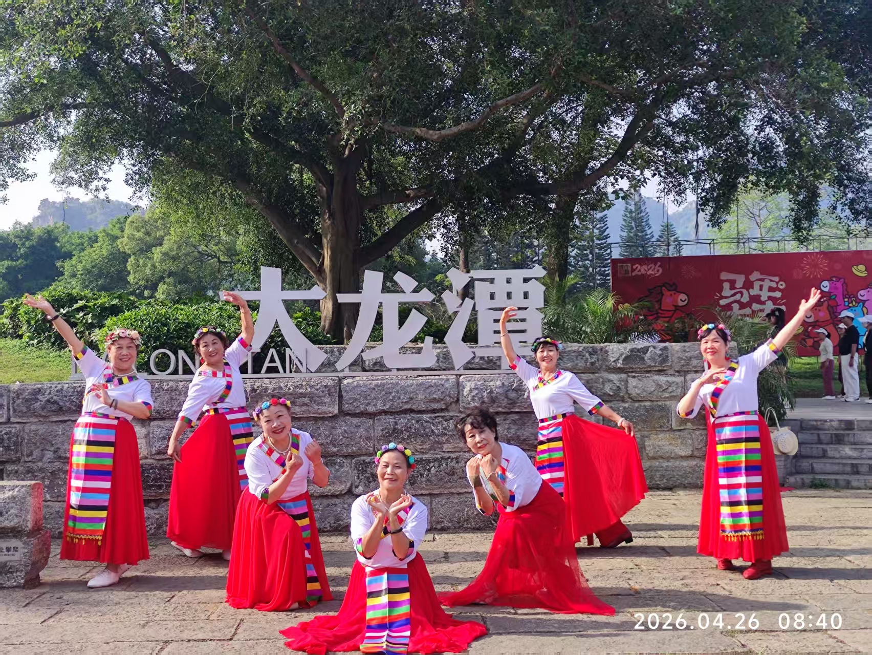 清晨八時許,隊員們身著繽紛的民族服裝,陸續彙聚於公園入口處的風景前。這裏是公園的“封面”,也是合影留念的首站。