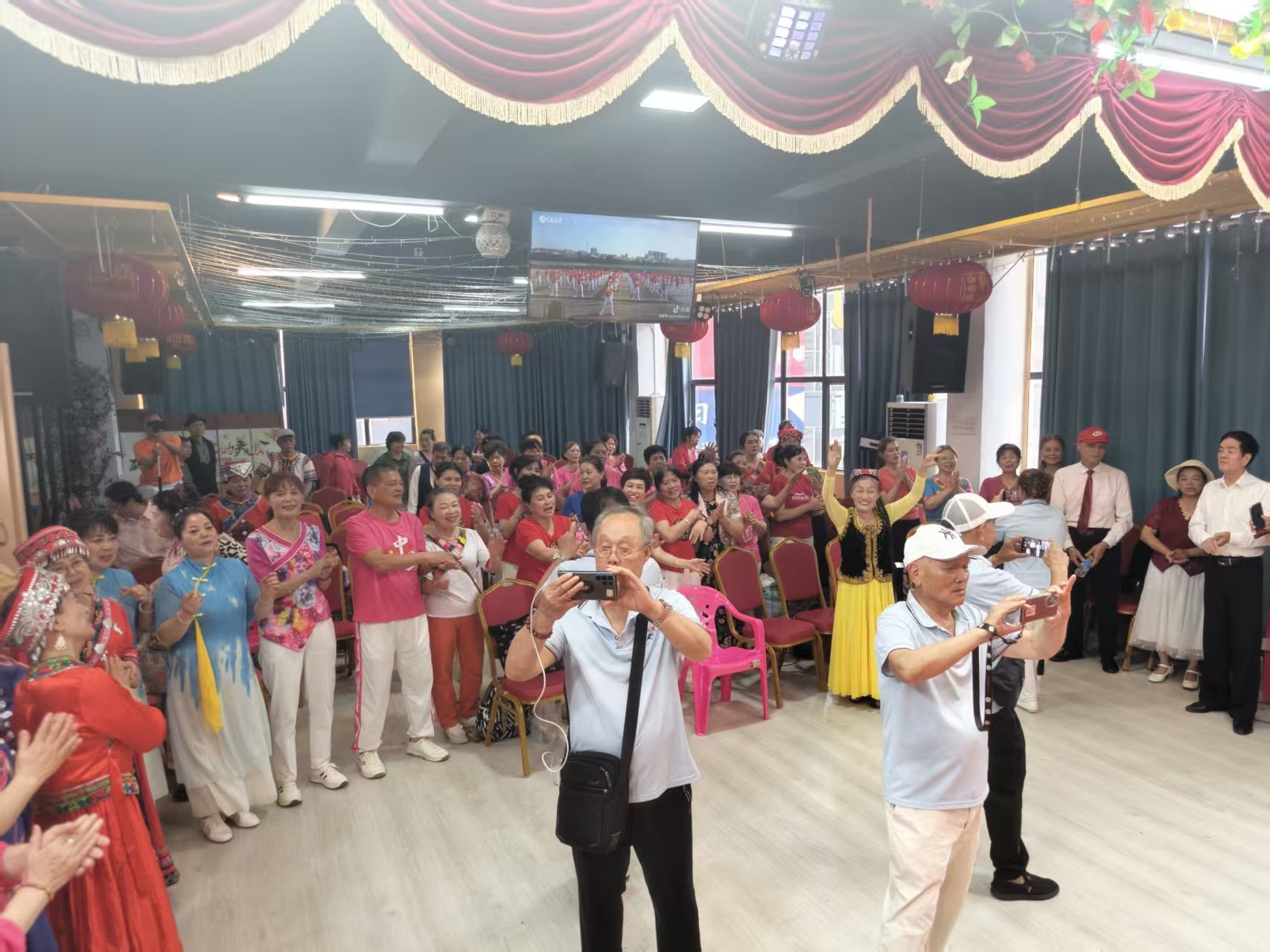 午後,活動移至千畝穀土菜館。文藝匯演在紫羅蘭藝術團《感恩祖國》的舞蹈中拉開序幕。隨後,各舞蹈隊與歌手釣魚張(微名)輪番登場,節目精彩紛呈。
