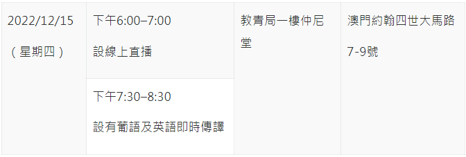 說明會將介紹上述措施的日程重點及具體安排,以及示範網上登記的操作步驟。線上直播的內容將於教青局臉書“教菁社區”重播,並設葡語及英語即時傳譯專場,說明會舉行的日期、時間等資訊請見下表。入場時須出示有關短訊及健康碼,並須全程佩戴口罩。倘有特別情況導致未能如期舉行說明會,教青局將以短訊通知已中籤的家長。查詢請於辦公時間內致電8397 2309。