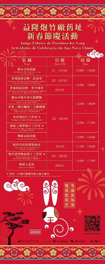 【澳門日報消息】文化局於新春期間將舉辦“益隆炮竹廠舊址新春節慶活動”,包括工作坊、非遺展演、陝西省民族藝術演出及藝遊人表演等多項春節藝文活動及表演,歡迎廣大市民及遊客參與,一同開展充滿文藝氣息的離島春節之旅。