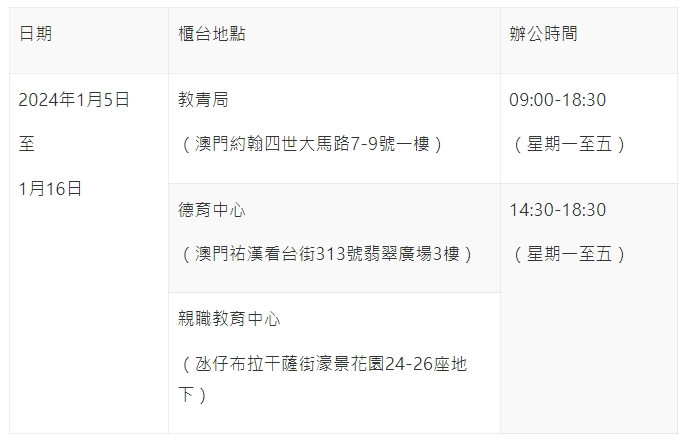 “中央登記”期間,倘家長未能透過電子方式自行完成登記,可帶備相關文件到以下教青局設立的服務櫃台,由專人協助辦理。持有超過90日逗留澳門許可的非澳門居民幼兒可參與中央登記,經親臨服務櫃台辦理後可自行於網上查詢,並按措施日程辦理幼兒教育的入學手續。有關詳情可瀏覽教青局網頁及宣傳小冊子,亦可於辦公時間致電8397 2309查詢。