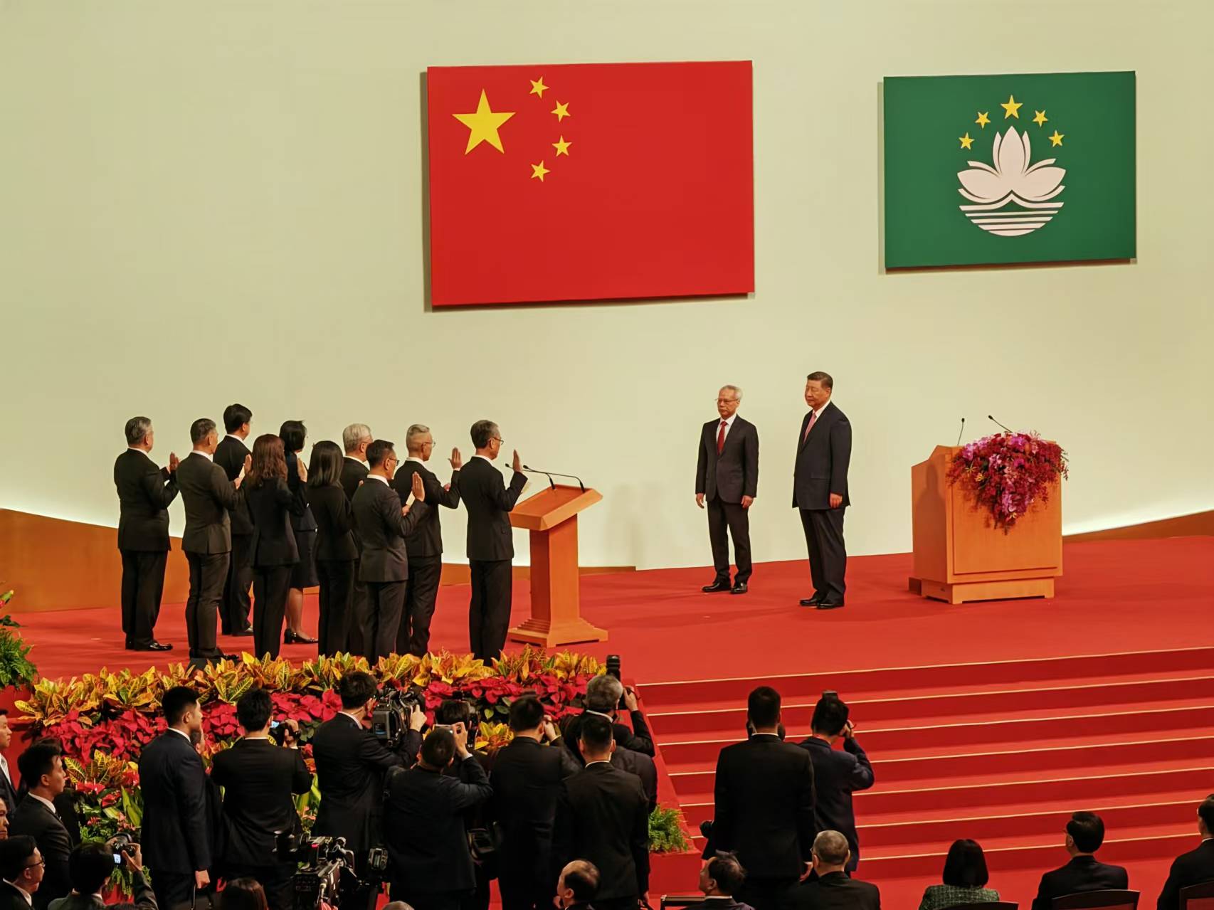 伴隨著莊嚴熱烈的氣氛,慶祝大會暨就職典禮正式開始。習近平攜夫人步入會場,全場起立鼓掌致敬。國歌奏唱後,習近平走上主席臺,岑浩輝莊嚴宣誓,承諾為澳門發展貢獻力量。宣誓完畢,兩人親切握手。