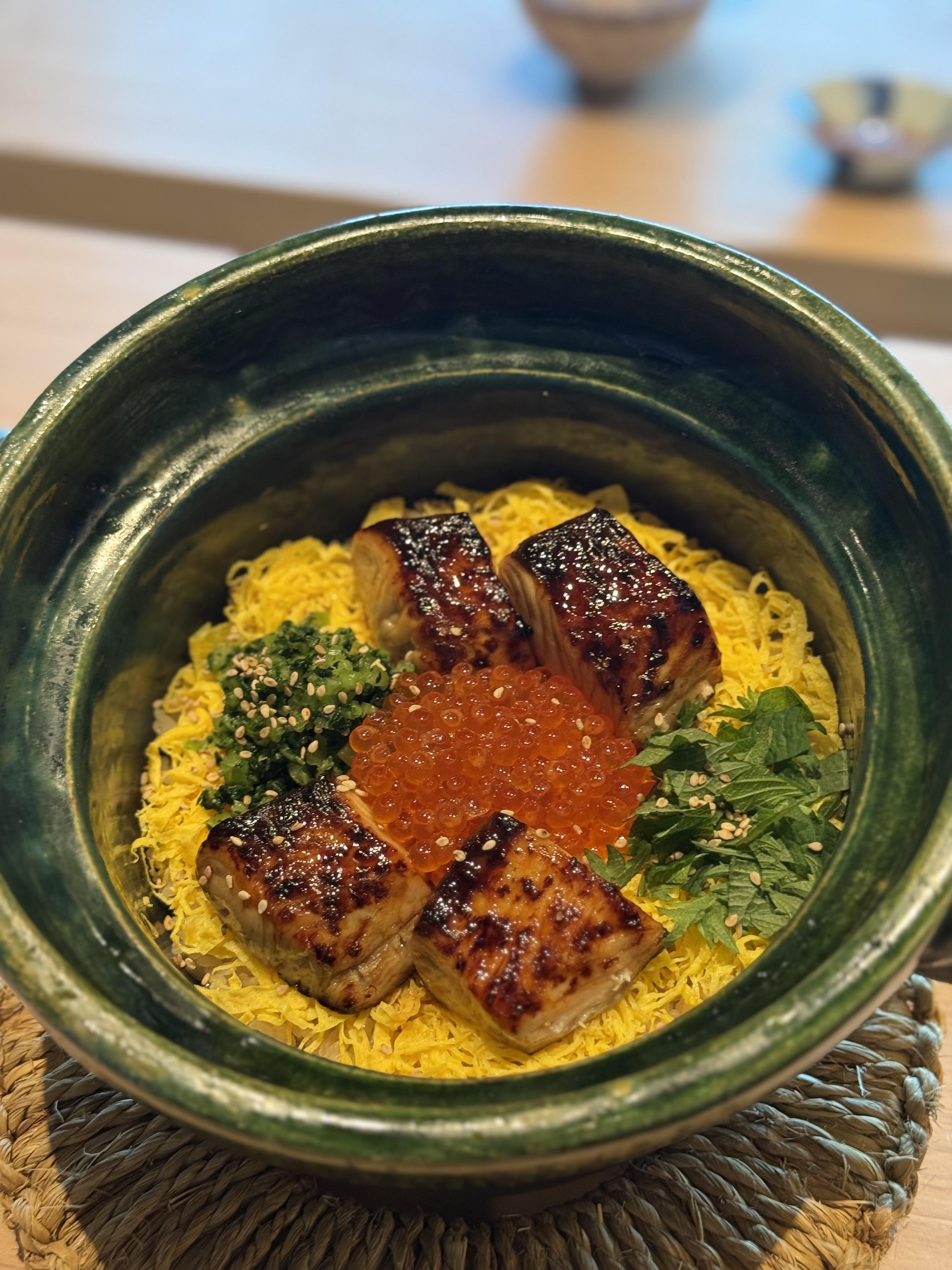 喜欢缟鲹鲑鱼子土锅饭,米饭金黄焦香,颗颗分明,缟鲹鱼与鲑鱼子铺陈其上,鲜味浓郁,层次和色泽丰富。土锅饭有两种食用方式,吃完第一碗后还可淋上热汤享用,更添暖意。