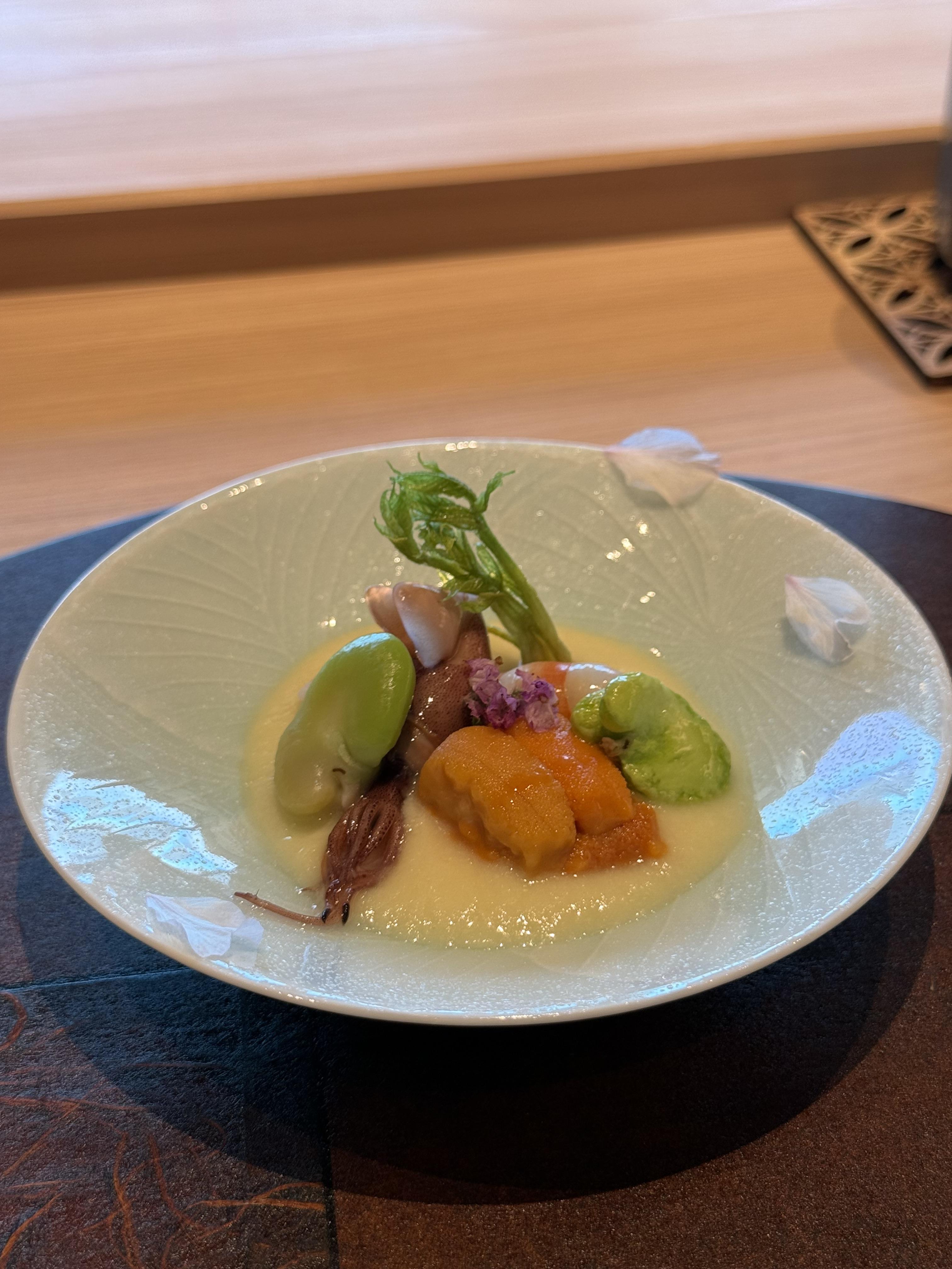 春季Oboro厨师做主晚餐菜单($268++)前菜以三道料理开启味觉之旅。莲子鲷鱼搭配鱼子酱与柚子奶油芝士,细腻滑嫩,轻熟成处理赋予鱼肉丰富的层次感。萤火鱿与香脆朴叶天妇罗交织脆与嫩的口感,展现春意盎然的生动气息。而白虾则以自然甜味轻柔唤醒味蕾。