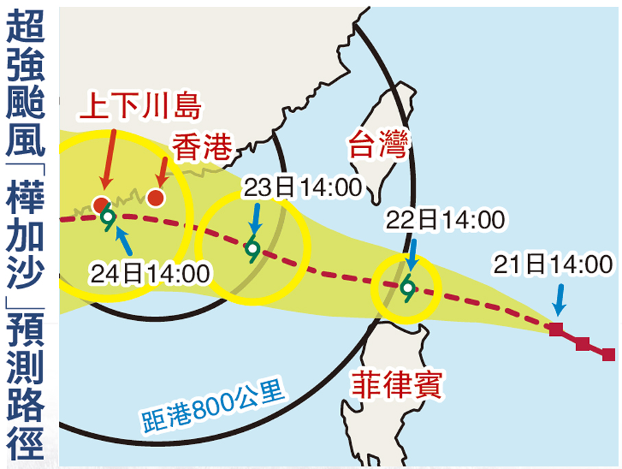 天文台按「樺加沙」目前的路徑推測,它將橫過呂宋海峽,最快今日日間進入本港800公里範圍,周三早上以超強颱風強度在香港南部掠過,屆時吹烈風至暴風,風力相當於十號風球,天文台科學主任林家輝指出:「按現時路徑,『樺加沙』進入南海時,因為其中心不會經過菲律賓及台灣的陸地,所以預計能保持風力。」
