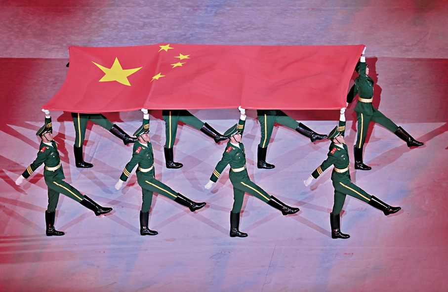 入場儀式完畢,全場起立,高唱中華人民共和國國歌。在雄壯的國歌聲中,五星紅旗冉冉升起、高高飄揚。