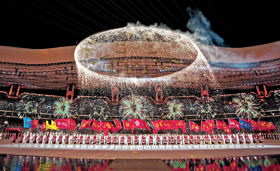 以《圓夢未來》為主題的文體展演拉開序幕。整個演出由「同根同源」「同心同緣」「同夢同圓」3個篇章組成,創新運用體育元素、藝術手段和前沿科技,生動詮釋了本屆全運會「激情全運會,活力大灣區」的主題。