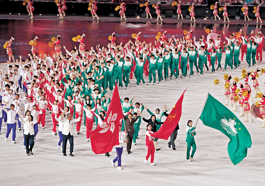 ●廣東省體育代表團、香港特別行政區體育代表團、澳門特別行政區體育代表團在入場儀式上共同入場。 新華社